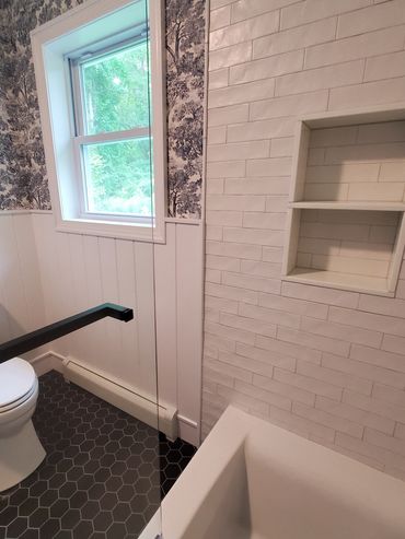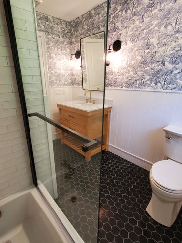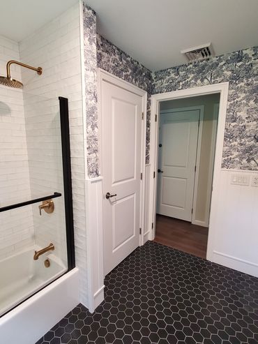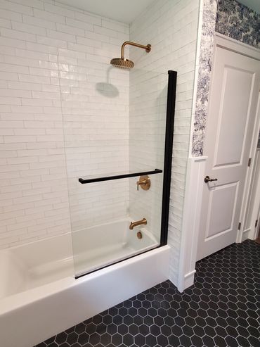 The floor is a 3" mesh mounted mosaic hex installed with Mapei's Pearl Gray grout. Handmade 2.5" x 10" matte white ceramic tile for the tub surround area set with 1/3rd offset staggered pattern and grouted with Mapei's Rain colored grout. Signature Hardwares brushed gold vanity and shower faucets. Dreamlines Aqua-Q frameless continuous pivot swinging glass door.