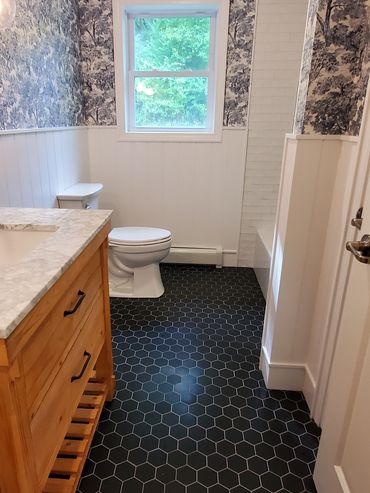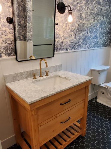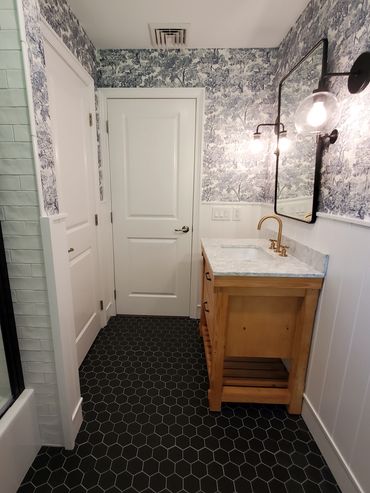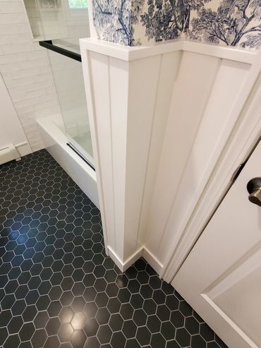 One of my favorite parts of this project was installing the wood waincoating for this bathroom! We used a 6" wide baseboard and an L cap backband board to cap it off at the top of the baseboard and on the top of the vertical tongue and groove boards. The 6" wide T&G boards were painted wtih Benjamin Moor's Chantilly Lace.
